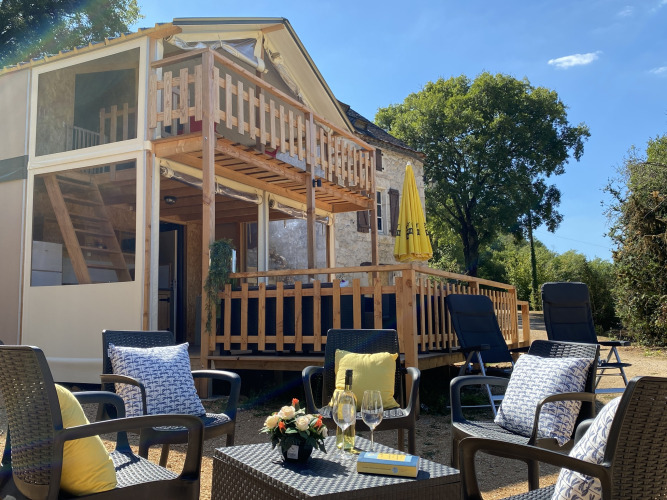Belle Vue ! Ces quatre tentes de luxe sont situées au centre de la ville, près du Domaine Versailles. Les tentes lodge font 60m2, avec un étage supérieur. La cuisine et le salon spacieux, les trois chambres et un espace sanitaire avec douche et toilettes garantissent un sentiment de vacances ultime. Les tentes lodge disposent d'une terrasse privée et d'un balcon au premier étage. Le design unique et l'emplacement abrité avec beaucoup d'intimité rendent l'hébergement spécial. La terrasse offre une vue panoramique sur la vallée de la Dordogne. Équipée d'un barbecue et de tables de pique-nique pour un usage partagé et de belles rencontres. En bref, Belle Vue, pour une expérience de vacances spéciale !