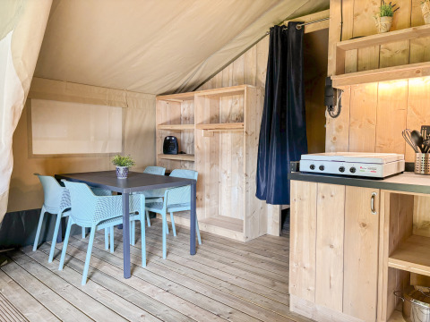 Cette tente safari est aménagée pour offrir une expérience de séjour confortable axée sur la vie en plein air. Grâce aux éléments en bois et à la façade enroulable, la tente est immédiatement connectée à l'extérieur.