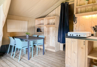 À l'intérieur, la cuisine est entièrement équipée avec tout le nécessaire, une cuisinière à gaz à quatre feux avec sécurité, un réfrigérateur, une cafetière et une bouilloire. En outre, la Safaritent incl. sanitair dispose de sa propre salle de bain avec douche, toilettes et lavabo.