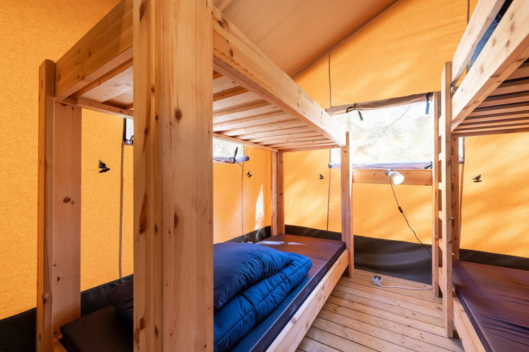 Le Villatent Wood est une tente de safari de luxe qui convient à un groupe ou à une famille de 5 personnes maximum. À ton arrivée, tout est prêt pour toi ! Le logement dispose d'un espace intérieur de 25m2, mais la terrasse avec des meubles est aussi un endroit idéal pour s'asseoir. Prépare les aliments dans la cuisine et dîne ensemble à la grande table de la terrasse, ou trouve une place dans l'une des chaises longues. C'est un plaisir supplémentaire de profiter des environs et du plein air ! Dans la tente, tu trouveras deux chambres à coucher, séparées par un mur en bois d'échafaudage et dans certains cas par une toile de tente. Il y a une chambre avec 1 lit double à baldaquin et une autre chambre avec 1 lit superposé et 1 lit pliant. Comme les lits font 2 mètres de long, ils conviennent aussi bien aux enfants qu'aux adultes.