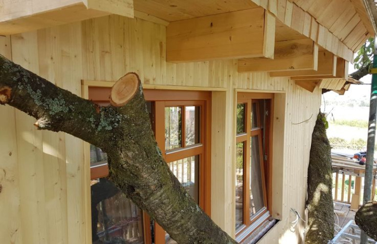 La maison est construite dans et autour d'un vieux cerisier, sans le stresser : elle repose sur des pilotis, est construite avec une ossature en bois et repose sur des fondations à vis pour protéger les racines de l'arbre. On accède à la cabane par un large escalier confortable. À l'intérieur, vous trouverez un mobilier moderne et de qualité.