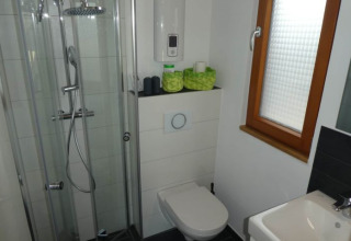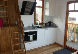 Dans le salon et la chambre du rez-de-chaussée, vous trouverez une kitchenette avec cuisinière et réfrigérateur, un coin repas, un grand lit double et une salle de bains avec douche et toilettes. Un escalier sûr et facilement accessible mène à l'espace de couchage à l'étage, dans le grenier, avec un autre lit double. Une barrière de sécurité pour enfants assure une sécurité supplémentaire.