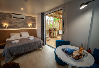 Ce joli mobil-home au glamping Beach Garden en Occitanie est adapté pour 6 personnes. Ce mobil-home de luxe en France est également disponible en version pour 4 personnes. Il y a une chambre avec 1 lit double et deux chambres avec 2 lits simples. Préparez vos repas dans la cuisine équipée avec électroménager, réfrigérateur, micro-ondes, plaque de cuisson et autres ustensiles. Profitez de votre repas fait maison dans le séjour où vous trouverez un canapé, une table et des chaises. La terrasse avec mobilier de jardin est également un endroit agréable pour commencer ou finir la journée. Il y a une salle de bain avec douche et lavabo, et des toilettes séparées. De plus, le logement dispose du chauffage et de la climatisation.