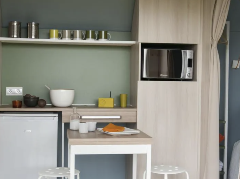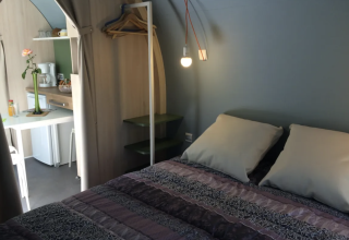 Échappez à la paix et au calme de la campagne dans ce site de glamping confortable avec une vue imprenable sur les prairies. Profitez d'un hébergement lumineux de 16 m², au calme et à l'ombre, à proximité des sanitaires. Dormez confortablement dans une chambre séparée avec un lit double (140 x 190) et une literie complète. Préparez des repas simples dans la cuisine compacte équipée d'un réfrigérateur, d'un congélateur, d'une plaque de cuisson, d'un micro-ondes et d'une cafetière. Détendez-vous à l'extérieur sur la terrasse privée de 7 m² avec mobilier de jardin, chaise longue et parasol. La tente dispose de sa propre place de parking et est non-fumeur et sans animaux. Idéal pour deux personnes qui aiment la simplicité, la nature et le silence.