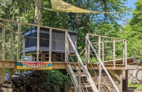 En arrivant au Thulba DAKTENTENDORP, vous tomberez immédiatement sur l'étonnante plate-forme Woodstock, suspendue au-dessus d'un amas de troncs d'arbres. Avec un peu de chance, vous pourrez admirer le parc de wakeboard à travers les arbres ou le centre du village de tentes sur le toit depuis votre propre terrasse.