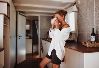 À l'intérieur, vous trouverez une cuisine entièrement équipée avec réfrigérateur, plaque de cuisson et four, ainsi qu'une salle de bains moderne avec douche, machine à laver et sèche-linge. Dormez dans le loft confortable avec un lit spacieux, tandis que le coin salon peut facilement être converti en lit d'appoint.