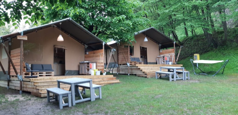 Sur la véranda, vous pouvez vous détendre sur deux canapés lounge ou dans le hamac. Sur l'emplacement, il y a également une table à manger en bois avec des bancs et deux chaises de camping réglables. Un barbecue à gaz est également à disposition. La tente ne possède pas de salle de bain privée ; vous utilisez les installations sanitaires du camping. Grâce à la grande véranda et aux équipements extérieurs, la vie en plein air occupe une place centrale ici.