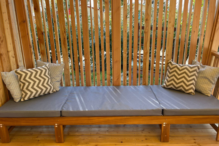 Sors à l'extérieur sur la spacieuse terrasse couverte avec des caractéristiques de protection solaire, une lampe suspendue et de beaux meubles en bois, y compris une luxueuse chaise longue duo. Ici, tu profiteras de l'ombre, de l'intimité et d'une vue à couper le souffle. Écoute ta musique préférée en te relaxant sur cette belle terrasse.