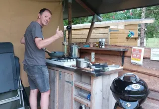 Cette robuste tente safari est installée sur une terrasse en bois et offre une expérience de glamping confortable au cœur du camping. À l'intérieur, vous trouverez un espace de vie spacieux avec une table à manger, des bancs et deux chambres à coucher. Les parents dorment sur des matelas boxspring confortables et, dans la seconde chambre, il y a un lit superposé ainsi qu'un lit simple. Oreillers, couettes et linge de lit sont inclus. La tente dispose d'un bloc-cuisine entièrement équipé, d’un grand réfrigérateur avec compartiment congélateur et d’une machine Nespresso. Pour la cuisson, il y a une cuisine extérieure mobile avec une plaque de cuisson à gaz à 4 feux.