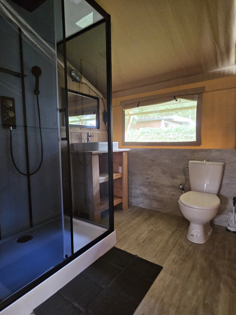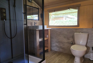 Pour rendre tes vacances glamping encore plus luxueuses, la tente safari est équipée d'une salle de bain complète avec une douche, des toilettes et un lavabo.