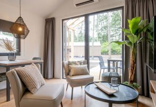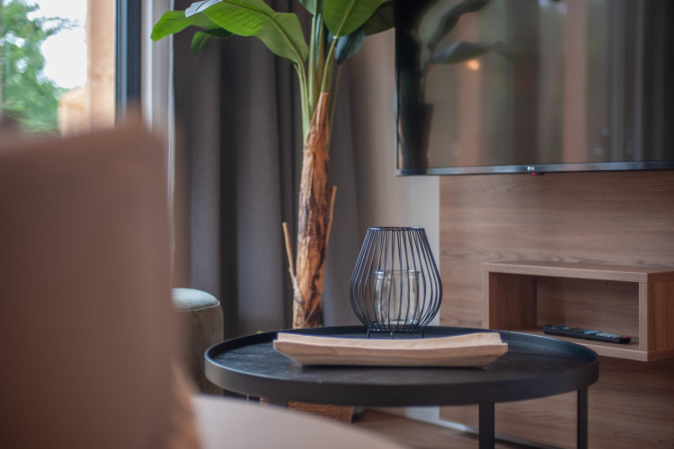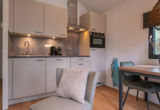 La tiny house est totalement conçue pour deux personnes. Dans l’espace de vie chaleureux, vous pouvez vous détendre sur le canapé, regarder vos séries préférées sur la smart TV (avec options de streaming), ou lire un livre avec les portes ouvertes sur la terrasse. Grâce à la climatisation, vous serez à l’aise en toute saison. La cuisine ouverte est compacte mais complète, avec un réfrigérateur, un micro-ondes et un lave-vaisselle, pour préparer facilement vos repas et ne pas avoir à vous soucier de la vaisselle.