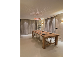 La villa est aménagée avec style et générosité, avec un salon lumineux, de grandes baies vitrées et une décoration élégante mettant en valeur les matériaux naturels et des tons chaleureux. L'intérieur respire la quiétude et la qualité. La cuisine ouverte moderne est entièrement équipée d'appareils haut de gamme et offre tout l'espace pour cuisiner ensemble et profiter de longs dîners conviviaux en famille ou entre amis.