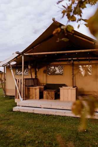 Chaque tente a sa propre cuisine, deux chambres et une salle de bain complète avec une douche confortable, des toilettes et un meuble de salle de bain. Une chambre est équipée de deux lits simples à sommier, l'autre d'un lit superposé et d'un lit simple. Les tentes sont équipées de la climatisation et d'un radiateur à gaz pour le chauffage. Ces tentes de safari de luxe se trouvent en bordure du parc de vacances et offrent une vue sur le Kuinderbos. L'avant des tentes peut être partiellement dézippé, ce qui transforme la cuisine en cuisine extérieure. La terrasse spacieuse avec de confortables canapés de salon borde un bel étang.