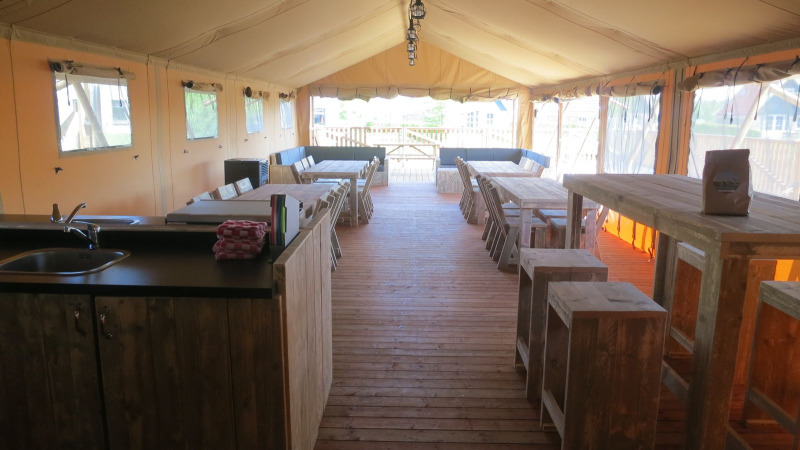 La tente de groupe est équipée d'une cuisine extra-large, de quatre tables à manger pour six personnes, d'un coin salon spacieux et d'une grande terrasse avec des meubles en bois d'échafaudage. Ici aussi, le côté peut être dézippé, ce qui te permet de profiter pleinement de la nature environnante. Toutes les tentes sont équipées de chauffages au gaz qui procurent une chaleur agréable le soir.