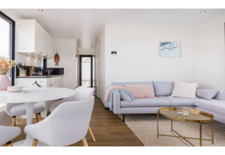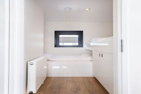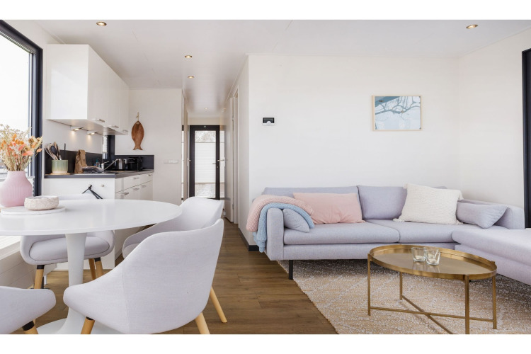 À l'intérieur, le séjour est lumineux et chaleureux grâce aux grandes fenêtres qui l'entourent. Depuis le canapé d'angle, vous pouvez regarder passer les bateaux, vous blottir avec un livre ou profiter d'une soirée cinéma à la télévision (pas de bouquet de chaînes, pensez à apporter votre propre appareil de streaming). L'espace salle à manger s'ouvre sur la cuisine moderne et ouverte, équipée de deux plaques à induction, d'un réfrigérateur avec compartiment congélateur, d'un lave-vaisselle, d'un four, d'une cafetière filtre, d'une Nespresso, d'une bouilloire et d'un grille-pain – idéal pour des petits-déjeuners tranquilles et des dîners faciles à bord.