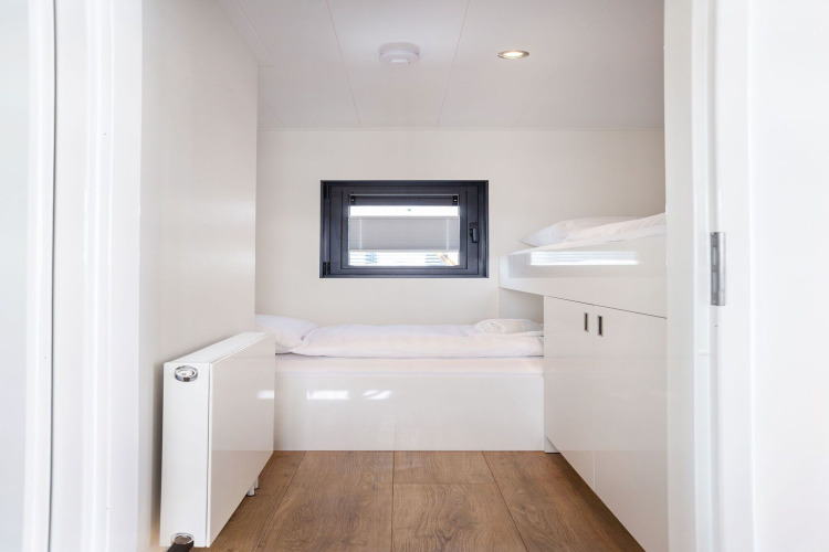 Houseboat Agua Dolce peut accueillir jusqu'à 4 personnes. La chambre principale dispose d'un lit double confortable (160x200 cm) et d'une armoire pour vos bagages. La seconde chambre possède un solide lit superposé connecté (80x200 cm) et sa propre armoire – parfait pour les enfants ou un couple supplémentaire. Vous voyagez avec un tout-petit ? Un lit bébé pliant (60x120 cm) et une chaise haute vous attendent, pour voyager plus léger. La salle de bain moderne est équipée d'une douche, de toilettes et d'un lavabo avec miroir.