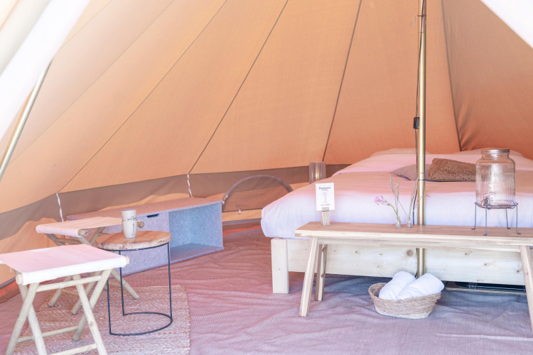 La tente Bell est la tente ultime pour toute famille qui aime l'espace et le style. Pour l'intérieur, nous avons choisi de collaborer avec divers entrepreneurs et designers (locaux), ce qui donne une Bell Tent au style magnifique, une expérience inoubliable. Le lit confortable est même déjà fait pour toi !