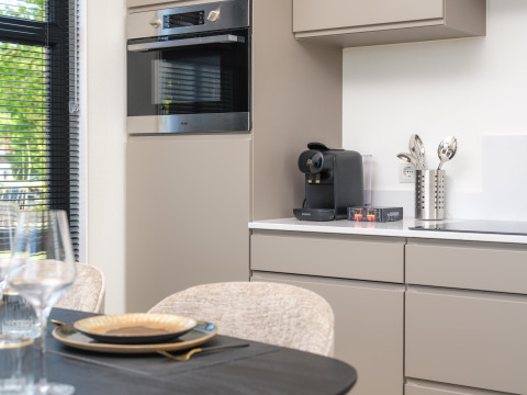 Grâce aux grandes fenêtres, la maison de 70 m² est agréablement spacieuse et lumineuse. Le séjour convivial dispose d'un coin salon confortable avec télévision, d'une grande table à manger et d'une cuisine ouverte moderne avec four combiné, lave-vaisselle et plaque à induction avec hotte intégrée.