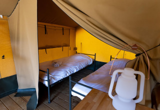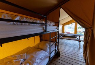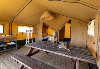 À l’intérieur de la tente safari, vous trouverez deux chambres douillettes déjà préparées à votre arrivée, ainsi qu’une cuisine pratique et bien équipée. Préparer un petit-déjeuner simple ou un dîner facile ne pose aucun problème ici. La terrasse extérieure avec des sièges confortables est l’endroit parfait pour des repas tranquilles, des jeux avec les enfants ou un apéritif au coucher du soleil après une journée sur le lac. Les sanitaires sont partagés, très propres et situés à seulement quelques minutes à pied.