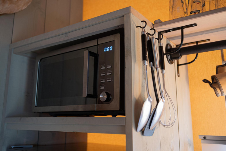 Dans la tente safari de luxe, tu trouveras également suffisamment de prises/de points de recharge, un éclairage confortable, un réfrigérateur, une cafetière, une bouilloire, un four à micro-ondes combiné, le chauffage central, un coffre-fort et le Wi-Fi gratuit ! Elle dispose également de pas moins de 3 téléviseurs avec Netflix !
