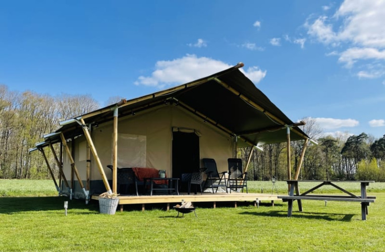 La tente safari est une tente de luxe pouvant accueillir jusqu'à 6 personnes, un hébergement idéal pour des vacances en famille ou en groupe ! Avec une surface de 40m2. Mange ensemble à la grande table avec des chaises, jette l'avant de la tente complètement ouverte et profite de la vue et de l'air frais. Prépare les repas dans la cuisine entièrement équipée et détends-toi à la fin de la journée sur l'un des luxueux fauteuils ou dans l'une des 2 chambres. Dans une chambre, tu trouveras un grand lit double, et dans l'autre, 2 lits superposés. D'une longueur de 2 mètres, les lits conviennent aussi bien aux enfants qu'aux adultes.