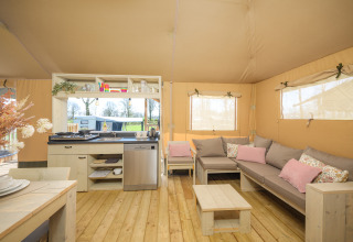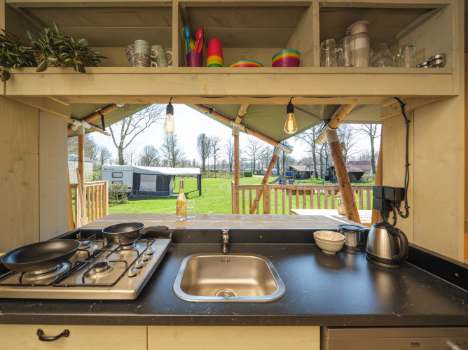 Commence ta journée détendue avec une tasse de café frais du Senseo, prépare un délicieux petit déjeuner ensemble dans la cuisine entièrement équipée, et fais des plans pour une journée pleine d'aventures. Grâce à la toile de tente rétractable, tu peux relier l'intérieur et l'extérieur sans effort. Cela te permet de profiter non seulement du confort de la cuisine pendant que tu cuisines, mais aussi de la vue sur le terrain et l'aire de jeux. De plus, il y a un bar intégré où tu peux socialiser, parfait pour prendre un verre ou une collation tout en profitant de la vue. Après une journée riche en événements, détends-toi dans le coin salon confortable, ou retire-toi dans la véranda spacieuse pour passer une soirée relaxante.