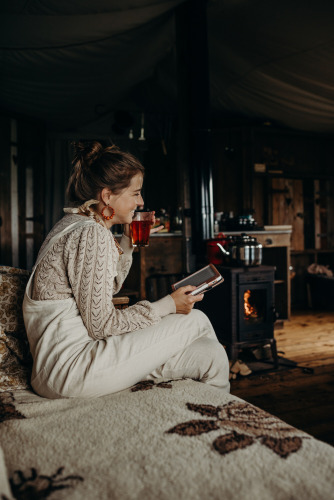 Aventurier et douillet : la vie sans électricité Pas d'électricité ? C'est ce qui la rend encore plus spéciale ! La tente est joliment éclairée par des lampes à huile et des bougies, et la cuisine se fait sur le poêle à bois. Il y a des bûches prêtes pour que ce soit bien chaud et douillet. Tu oses ?