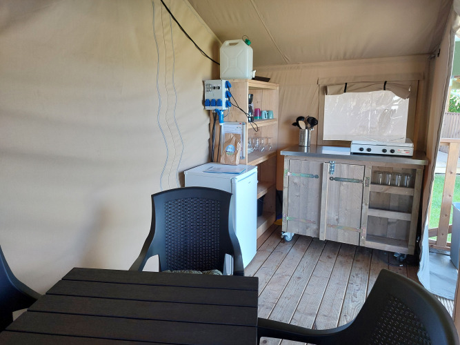En entrant dans la tente safari, vous remarquez immédiatement la luxueuse cuisine roulante sur votre droite. Cette cuisine peut être roulée à l'extérieur pour cuisiner en plein air ou à l'intérieur. La tente est entièrement équipée d'une cuisinière à gaz à 4 feux, d'une bouilloire, d'une cafetière, de casseroles, d'un réfrigérateur et de vaisselle.