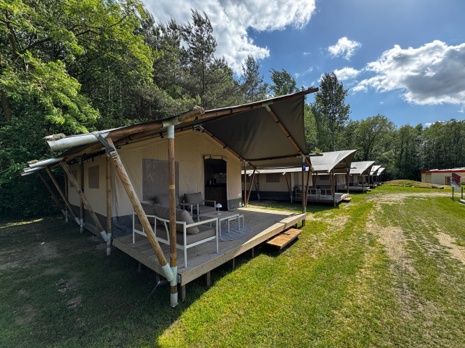Le Lodgetent 6 est une tente de safari qui donne la sensation ultime de camping, combinée avec une cuisine et des toilettes. La tente meublée est au niveau du sol, convient pour 6 personnes et on y accède par quelques marches. Dans l'espace de vie, tu trouveras un coin repas et une cuisine compacte. Au total, cette tente de safari dispose de 1 toilette et de 2 chambres, 1 avec 1 lit double et 1 avec 2 lits superposés. Il y a une terrasse couverte et meublée à l'entrée de la tente. Le bâtiment sanitaire comprenant des douches se trouve à proximité. Tu peux garer ta voiture dans l'un des parkings situés à proximité et le Wi-Fi est disponible gratuitement.