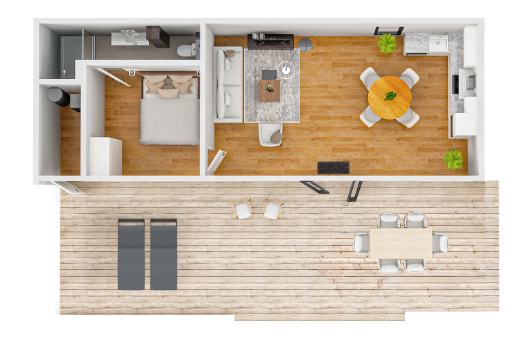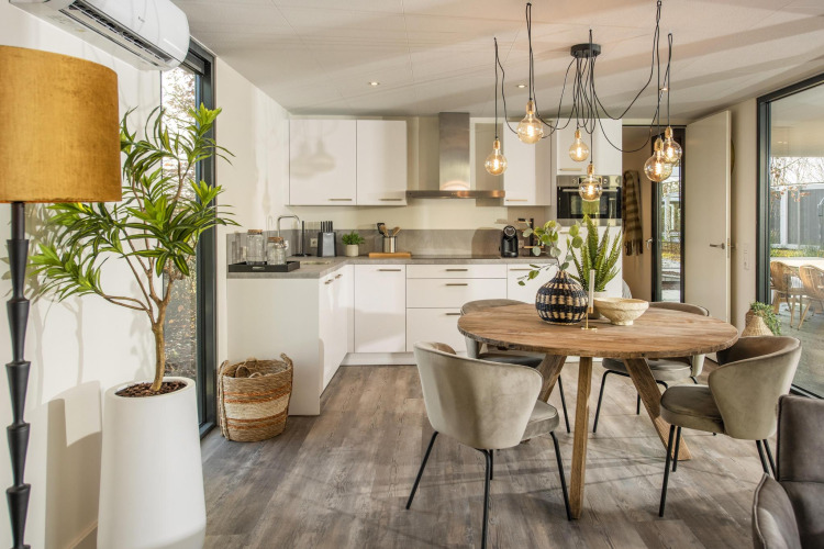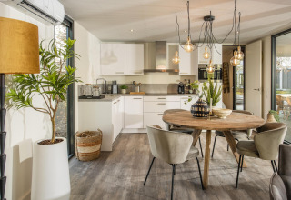 Le salon élégant dispose de la climatisation, d'une télévision à écran plat et d'un coin salon confortable pour deux personnes. La cuisine ouverte, équipée d'un combiné four-micro-ondes, d'une plaque à induction, d'un lave-vaisselle, d'un réfrigérateur avec compartiment congélateur, d'un robinet d'eau bouillante et d'une machine à café Lavazza Blue ou Dolce Gusto, met tout le confort à portée de main. La chambre offre un lit confortable avec linge de lit inclus, tandis que la salle de bain attenante est dotée d'une douche à l'italienne moderne. Malgré sa taille compacte, le Bos Cube paraît spacieux – avec beaucoup de lumière naturelle, des rangements astucieux et une atmosphère chaleureuse.