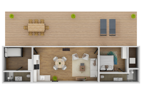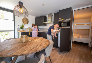 Avec une surface de 68 m², ce cube moderne est étonnamment spacieux. Le salon est lumineux et chaleureux, avec un coin salon confortable, une télévision à écran plat, la climatisation et le Wi-Fi gratuit. Dans la cuisine ouverte entièrement équipée, vous trouverez des appareils de luxe tels qu'un four à micro-ondes combiné, une plaque à induction 4 feux, un réfrigérateur avec compartiment congélateur, un robinet d'eau bouillante et un lave-vaisselle. Les chambres sont préparées avec des lits faits à l'arrivée (si souhaité) et offrent un espace de couchage confortable pour cinq personnes. Les deux salles de bains sont attenantes aux chambres et disposent d'une douche spacieuse et de toilettes. À l'extérieur, une grande terrasse avec auvent vous attend : l'endroit idéal pour le petit-déjeuner au soleil du matin ou un jeu dans l'air du soir.