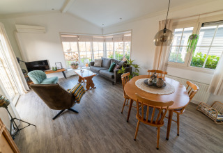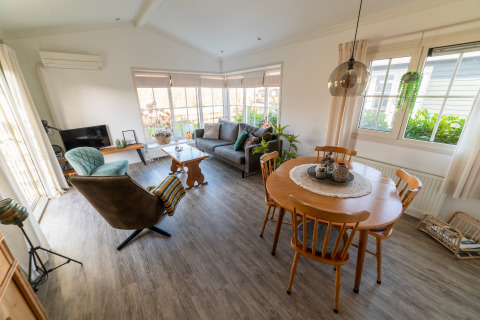 À l’intérieur, vous trouverez un séjour lumineux et moderne équipé d’une smart TV et de la climatisation pour être toujours à l’aise, quelle que soit la météo. La cuisine ouverte est entièrement équipée, ce qui rend la préparation de vos plats préférés facile après une journée sur l’eau ou à explorer le village. Pouvant accueillir jusqu’à 5 personnes avec un agencement pratique, vous pourrez vous détendre ensemble tout en préservant votre intimité.