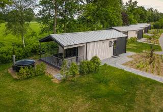 Le lodge dispose d'une chambre à coucher, avec 1 salle de bain équipée d'une douche, d'un lavabo, de toilettes et d'un sauna. Par les grandes portes coulissantes en verre, tu accèdes à la terrasse spacieuse et ensoleillée avec des meubles de jardin où tu peux profiter du plein air jusqu'à des heures tardives.