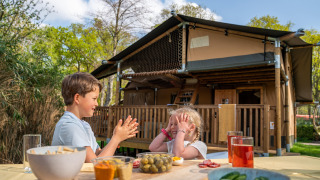 Profitez de vacances inoubliables dans l’une de nos Safarilodge Deluxe ! Avec 2 chambres spacieuses, vous pourrez passer des vacances bien méritées avec 5 personnes ! Depuis la Safarilodge Deluxe, vous avez une vue directe sur l’une de nos nombreuses aires de jeux, ainsi les enfants peuvent jouer librement pendant que les parents se détendent sur les confortables chaises longues sous la véranda. La Safarilodge Deluxe dispose d’une cuisine entièrement équipée, incluant un lave-vaisselle, ainsi que d’une salle de bains avec douche et toilettes. Les Safarilodges sont situées entre nos emplacements de camping confort spacieux. Vous profiterez ainsi de la véritable vie en plein air, mais avec le luxe d’une Safarilodge Deluxe.