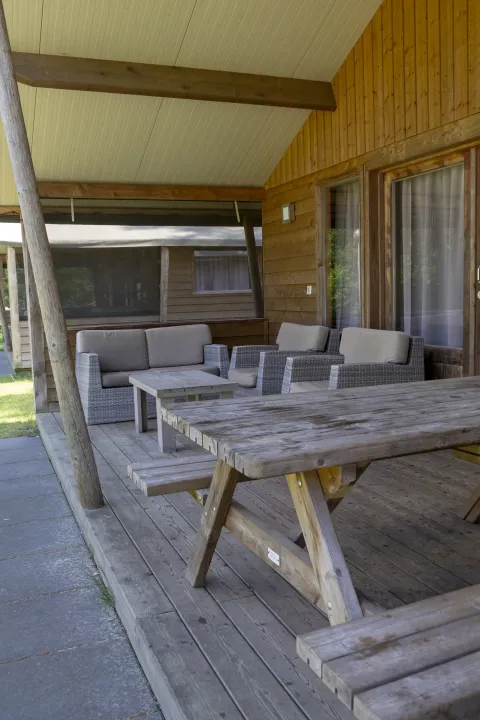 Profitez de vacances inoubliables dans l’une de nos Safarilodge Deluxe ! Avec 2 chambres spacieuses, vous pourrez passer des vacances bien méritées avec 5 personnes ! Depuis la Safarilodge Deluxe, vous avez une vue directe sur l’une de nos nombreuses aires de jeux, ainsi les enfants peuvent jouer librement pendant que les parents se détendent sur les confortables chaises longues sous la véranda. La Safarilodge Deluxe dispose d’une cuisine entièrement équipée, incluant un lave-vaisselle, ainsi que d’une salle de bains avec douche et toilettes. Les Safarilodges sont situées entre nos emplacements de camping confort spacieux. Vous profiterez ainsi de la véritable vie en plein air, mais avec le luxe d’une Safarilodge Deluxe.