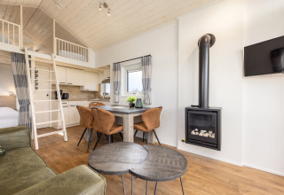 À l'intérieur, vous trouverez un salon cosy avec un poêle à gaz où vous pouvez vous blottir avec un livre après une journée en plein air. La cuisine ouverte est compacte mais pratique, idéale pour préparer le petit-déjeuner ou un dîner simple. Au rez-de-chaussée, un espace nuit confortable est astucieusement dissimulé derrière un rideau, vous offrant un peu plus d'intimité dans ce tiny house. Les enfants adoreront la mezzanine ludique, accessible par une échelle – un vrai refuge et lieu d’aventure juste pour eux. Une salle de bain moderne complète la maison, vous offrant tout le nécessaire dans un espace efficace.