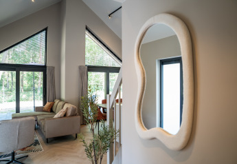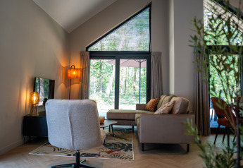 • Cabane moderne à Hofparken Wiltershaar à Gelderland, entourée d’arbres verts sous la lumière du soir.