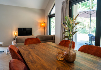 Espace extérieur d'une tiny house avec façade en bois, sauna et jacuzzi au Holiday Park Mölke, Pays-Bas.