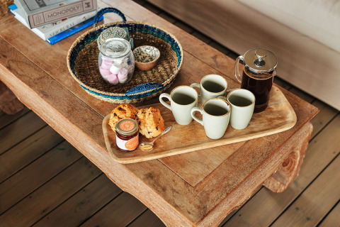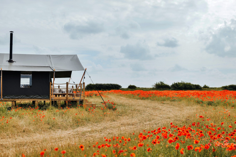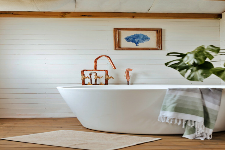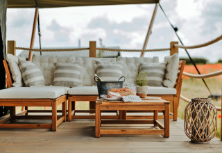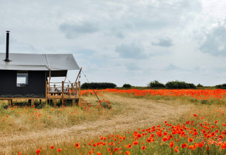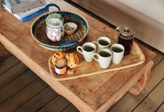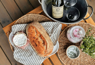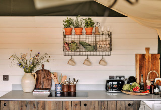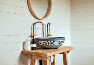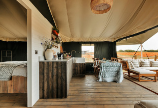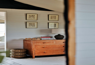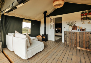 La chambre séparée offre un confortable lit king-size pour des nuits reposantes. Après une journée au grand air, la salle de bain privée est un vrai plaisir : installez-vous dans la grande baignoire ronde et détendez-vous dans votre propre petit havre de paix façon spa.