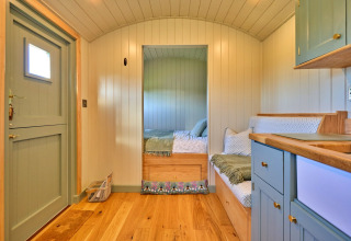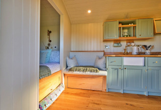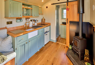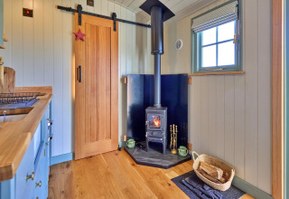 À l’intérieur, vous trouverez un coin salon douillet avec un poêle à bois crépitant – parfait pour vous blottir avec un verre de vin après une journée de découverte. La petite cuisine entièrement équipée comprend un four électrique, des plaques de cuisson et un réfrigérateur, pour préparer facilement un petit-déjeuner au lit ou un simple dîner à deux. Au fond de la cabane, le confortable lit double (140 cm) vous invite à ralentir le rythme, faire la grasse matinée et vous réveiller avec vue sur les champs.