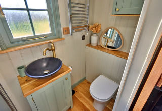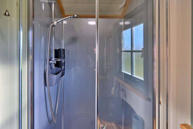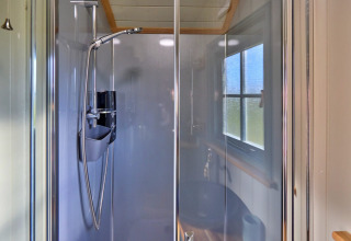 La salle d’eau moderne est dotée d’une cabine de douche, d’un sèche-serviettes chauffant et de toilettes, vous offrant tout le nécessaire pour un séjour détendu. Malgré sa petite taille, la cabane est fonctionnelle et complète – idéale si vous aimez le confort des tiny houses avec de véritables équipements.