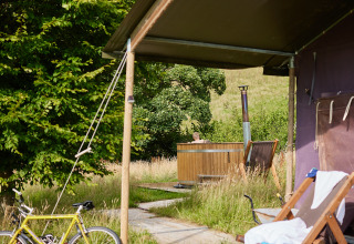 Sanitaires privés : de l'eau chaude et de vraies toilettes. Pas de douches communes, juste ta propre douche privée avec de l'eau chaude juste à côté de ta tente. De plus, la maison de la tente dispose d'une véritable chasse d'eau - c'est tellement agréable pendant ton séjour dans la nature.