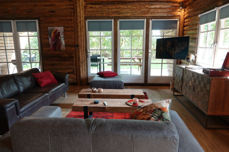 La casa è realizzata con caldi legni, pietra naturale e ampie vetrate, sormontata da un tradizionale tetto in paglia. Appena entri, il soffitto alto e la grande parete vetrata del soggiorno attirano subito l’attenzione. La luce naturale invade l’ambiente, creando un’atmosfera luminosa e rilassante dove puoi rilassarti, chiacchierare per ore o semplicemente distenderti sul divano dopo una giornata fuori.
