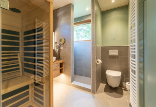 La prima camera da letto dispone di un comodo letto matrimoniale e di un bagno privato con doccia, lavabo e wc. Il vero lusso qui? La tua sauna privata, perfetta per riscaldarti dopo una passeggiata nella foresta o semplicemente per rilassarti alla fine della giornata.