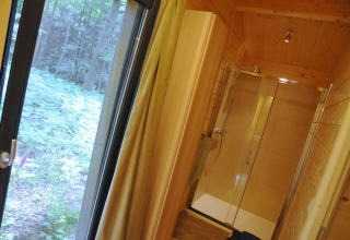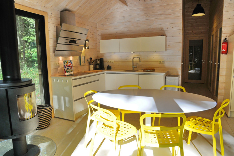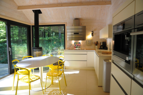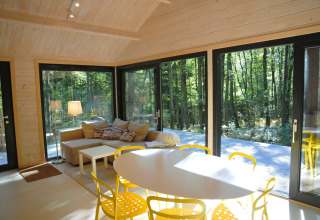 All’interno troverai un soggiorno luminoso e contemporaneo, con ampie finestre che permettono alla vista del bosco di diventare protagonista. C’è un comodo divano su cui rilassarsi, un tavolo da pranzo per pasti tranquilli insieme e una cucina moderna e completamente attrezzata dove potrai facilmente cucinare i tuoi piatti preferiti.