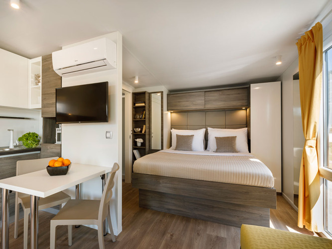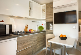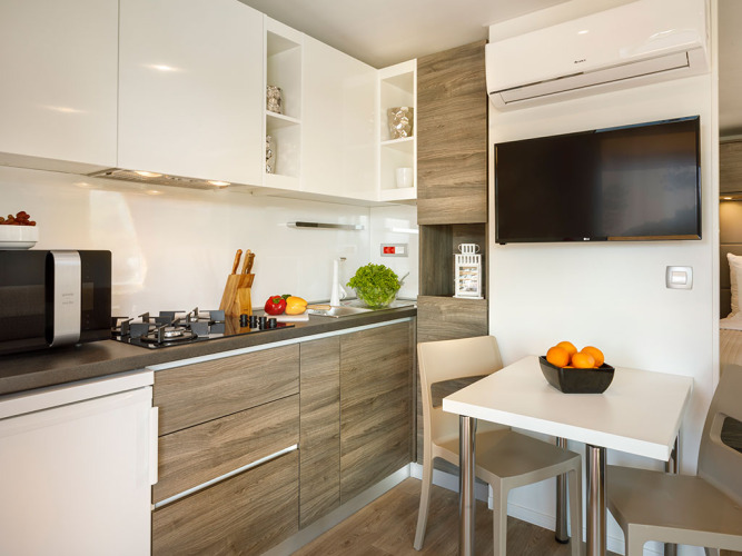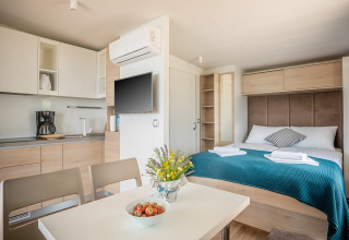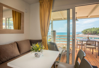 Il Lungomare Chalet per 2+1 Spectacular Seaview si trova a pochi passi dalla spiaggia e dalla passeggiata lungomare completamente attrezzata nel Lungomare Premium Village. Lo chalet dispone di una camera da letto con letto matrimoniale e di un divano letto nella zona giorno, una cucina ben attrezzata con piano cottura elettrico e microonde, e un bagno con doccia. Gli ospiti possono rilassarsi sulla spaziosa terrazza, che offre una zona salotto e lettini prendisole, godendo di una vista panoramica sul mare, con possibilità di barbecue su richiesta. I comfort aggiuntivi includono aria condizionata, TV satellitare, Wi-Fi gratuito, cassaforte e ferro da stiro. Con una superficie abitabile di 18 m² più una terrazza di 14 m², lo chalet può ospitare fino a tre adulti e accoglie animali domestici su richiesta. Per maggiore comodità, Valfresco Direkt consegna direttamente al tuo chalet prodotti alimentari locali e pasti pronti appena preparati.