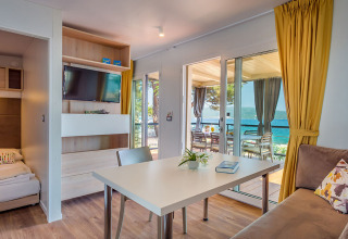 La Lungomare Home per 4+2 si trova vicino alla spiaggia, nell’area centrale del Lungomare Premium Village, sul lato mare con una splendida vista sul mare. Progettata per comfort e funzionalità, la casa può ospitare fino a quattro adulti e due bambini. Dispone di due camere da letto, tra cui una camera matrimoniale con letto doppio e una cameretta per bambini con due letti singoli (80 x 200 cm), un soggiorno con divano letto e TV satellitare, e una cucina completamente attrezzata con microonde e piano cottura elettrico. Ci sono due bagni con doccia. L’ampia terrazza offre una zona salotto e lettini prendisole, perfetti per rilassarsi all’aperto. Altri servizi includono aria condizionata, Wi-Fi gratuito, cassaforte e ferro da stiro. La casa misura 32 m² all’interno e dispone di una terrazza di 24 m². Gli animali domestici sono ammessi e gli ospiti possono usufruire anche del servizio VALFRESCO DIREKT, che consegna prodotti locali e pasti pronti appena preparati direttamente presso l’alloggio.