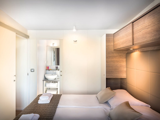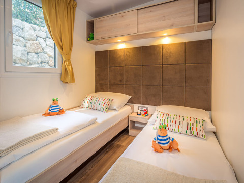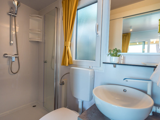 La Lungomare Home per 6+2 si trova vicino alla splendida spiaggia di ciottoli all'interno del Lungomare Premium Village. Con uno spazio interno di 38 m², può ospitare fino a sei adulti e due bambini, rendendola ideale per famiglie numerose o gruppi. La casa dispone di tre camere da letto—una con letto matrimoniale e due con due letti singoli ciascuna—, un ampio soggiorno con un divano letto aggiuntivo e TV satellitare, e una cucina completamente attrezzata con microonde e piano cottura elettrico. Ci sono anche due bagni con doccia e servizi igienici.