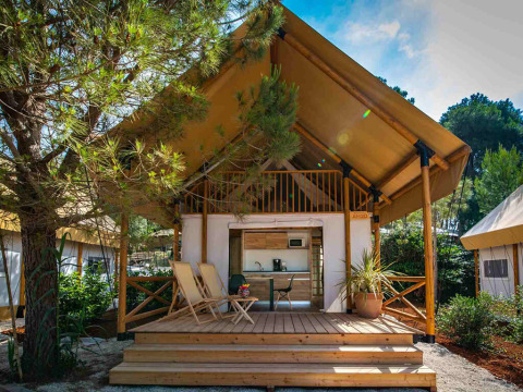 All'esterno, la tenda include una terrazza privata, perfetta per rilassarsi e godersi l'ambiente circostante. Biancheria da letto, asciugamani, pulizia, parcheggio e tassa di soggiorno sono inclusi nel prezzo. Gli animali sono i benvenuti con un costo aggiuntivo.