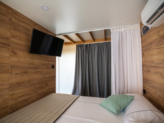 La tenda dispone di due camere da letto, ciascuna con un letto matrimoniale, e un bagno privato con doccia, lavandino e WC. L'angolo cottura è dotato di frigorifero, fornello, microonde e macchina da caffè, e c'è una TV satellitare per l'intrattenimento.